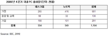 시장조사기관인 한국IDC는 '2009년 4분기 국내 PC시장 분석' 보고서를 통해 데스크톱과 노트북의 출하량은 각각 55만대와 54만대를 기록했다고 발표했다.