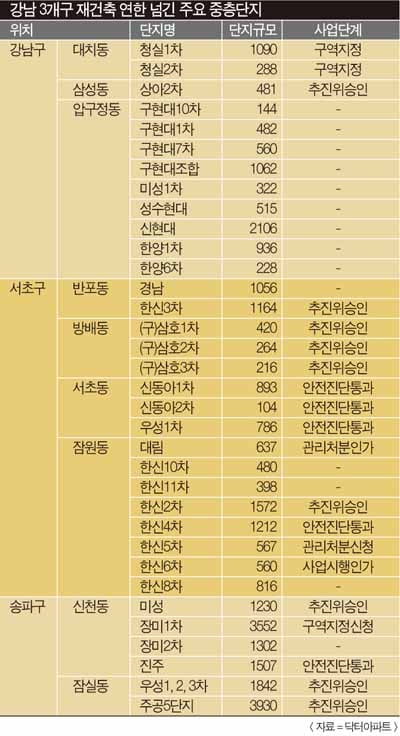 이 가운데 은마아파트와 동일한 사업단계로 안전진단을 앞두고 있는 단지는 40개 단지 3만5076가구로 전체의 71%다. 닥터아파트 이영진 소장은 "은마의 안전진단 통과로 '안전진단 통과 불가' 공식이 깨짐에 따라 이들 단지들도 사업추진에 박차를 가할 전망"이라고 말했다.