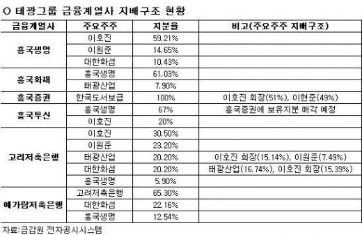 업계에서는 이번 결정이 이호진 회장의 금융계열사 지배력 강화를 위한 포석이란 분석이다. 태광그룹은 현재 흥국생명ㆍ흥국화재(4,135원 ▼45 -1.08%), 흥국증권ㆍ흥국투신, 고려ㆍ예가람상호저축은행 등 6개의 금융계열사를 거느리고 있다.