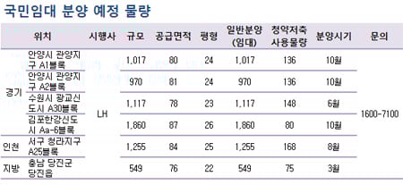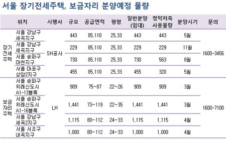 공공분양은 지난해 인기를 끌었던 별내지구, 관양지구, 도촌지구 물량이 있고 공공임대는 광교신도시에서 분양물량이 나온다. 국민임대는 입지여건이 좋은 관양지구와 개발계획이 풍부한 청라지구 물량이 대기 중이다. 장기전세주택도 강남권에 물량이 집중돼 청약자들은 선택의 폭이 넓어진다.