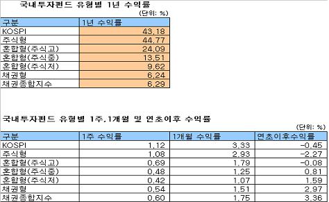 지난 한 주간 코스피지수가 외국인 순매수세에 힘입어 1680선까지 오르면서 국내 주식형펀드의 수익률이 3주 연속 플러스를 기록했다. 해외 주식형펀드도 글로벌 증시 상승으로 양호한 수익률을 올렸다.