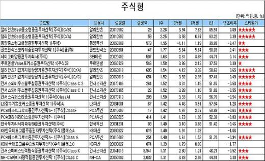 또 '동양중소형고배당증권투자신탁 1(주식)' 1.95%, '골드만삭스코리아증권자투자신탁 1[주식]종류N' 1.77% 등 평균을 크게 웃도는 수익률로 돋보였다.