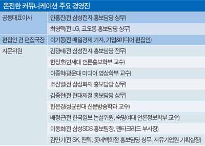 안홍진(전 삼성전자 홍보담당 상무), 최영택(전 LG, 코오롱 홍보담당 상무) 공동대표를 비롯해 자문위원으로 참여한 김광태(전 삼성전자 홍보담당 전무), 조진일(전 삼성화재 홍보담당 상무) 씨 등이 '온전한 커뮤니케이션'의 주축이다. 김종현(전 현대제철 홍보담당 상무), 김만기(전 SK, 팬텍, 롯데백화점 홍보담당 상무), 이동희(전 삼성SDS 홍보팀장) 씨 등도 자문위원에 동참한 멤버다. 이 정도면 대한민국 '홍보달인'들의 집합소라 할 만하다. 매일경제 기자를 거쳐 '기업&미디어' 편집인이었던 이기동 씨는 '온전한 커뮤니케이션'의 PR전문 월간지 'The PR'의 편집인 겸 편집국장으로 참여해 힘을 실었다.