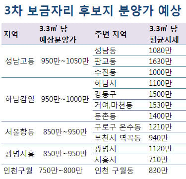 3차 후보지 중 분양가가 가장 높게 예상된 곳은 성남 고등지구다. 부동산 전문가들은 판교신도시와 강남권이 가까운 입지를 고려해 3.3㎡당 950만~1050만원선으로 내다봤다. 하남 감일지구는 위례신도시와 인접해 하남 미사지구보다는 높은 950만~1000만원으로 예상됐다. 이는 현 시세의 70%를 밑도는 수준이다.