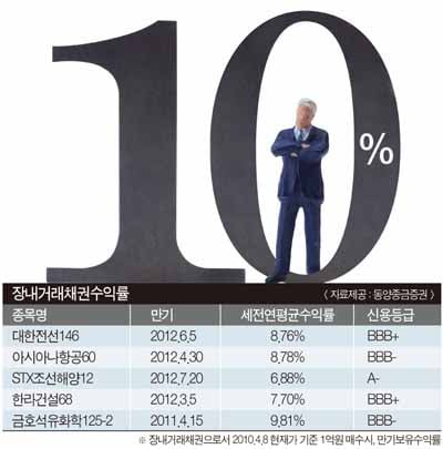 하지만 최근 장내에서 거래되고 있는 회사채를 보면 연평균 수익률이 10%에 가까운 것들이 많다. 물론 이들 채권에 투자를 하기 위해서는 일정부문 리스크를 감수해야 한다. 수익률이 높은 채권은 그만큼 기업 신용도가 낮기 때문이다.