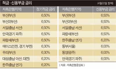 4월22일 현재 전국 105개 저축은행의 정기적금 평균 금리는 연 5.45%. 연 6.0% 이상 금리를 제공하는 곳은 6.5%로 가장 높은 부산저축은행을 포함해 20곳이다.