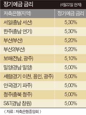 4월22일 현재 저축은행 정기예금 최고 금리(1년 만기 정기예금 기준)는 서일(충남 서산), 한주(충남 연기)저축은행의 연 5.3%다. 이들을 포함해 연 5% 이상의 금리를 제공하는 곳은 부산, 부산2, 보해(전남 목포), 밀양(경남 밀양), 세람(경기 이천), 안국(경기 파주), 청주(충북 청주), S&T(경남 창원)저축은행 등 10곳이다.