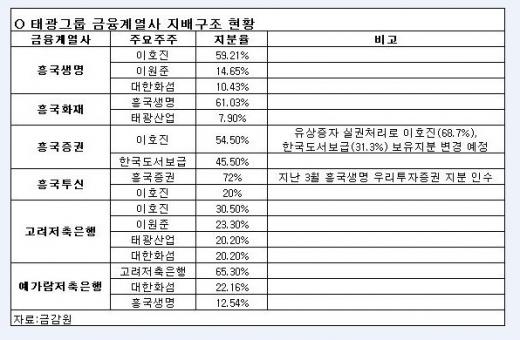 지난달 흥국증권의 유상증자에서 한국도서보급이 청약을 포기한 것도 이런 배경에서라는 관측이다. 또 지난해 말에는 흥국생명이 태광그룹의 주력 계열사인 태광산업이 보유한 흥국화재 지분 61%를 인수해 최대주주로 올라섰다.