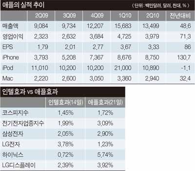 애플 주가는 상승했고 우리 시장도 반응했다. 반응 강도는 오히려 인텔 때보다 강했다. 코스피지수가 1.72%(인텔 실적 발표 때는 1.45%, 이하 인텔 발표 때 상승률) 올랐고 하이닉스 5.74%(0.72%), 삼성전자 2.90%(2.05%), LG디스플레이 3.92%(2.39%) 등 대형 IT주들이 일제히 급등했다.
