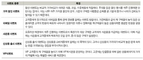 A 이벤트는 짧은 기간 내에 회원의 참여율을 높이고 단골고객을 만들 수 있는 가장 효과적인 방법이다. 그러나 많은 이벤트는 소비자에게 반짝 관심을 얻지만 금방 잊혀질 수 있다는 점을 명심하자. 즉 고객 참여를 꾸준히 유도할 수 있는 주기적인 쇼핑몰 이벤트가 필요하다.