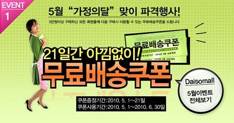 균일가 생활용품기업 ㈜다이소아성산업(대표 박정부)의 온라인 쇼핑몰인 다이소몰(www.daisomall.co.kr)에서 5월 가정의 달을 맞이해, 오는 5월 21일까지 ‘5월 “가정의 달” 맞이 이벤트’를 실시한다.