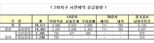 2차 지구의 사전예약 물량은 총 1만8511가구로 이 중 분양주택은 1만4497가구. 보금자리 공공 임대주택 4014가구(10년 임대 2765가구, 분납임대 1249가구)가 처음으로 공급된다.