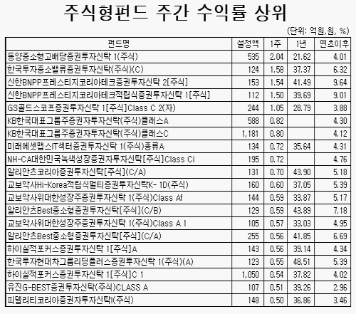 '동양중소형고배당증권투자신탁 1(주식)'가 2.04% 수익률로 2주 연속 주간 수익률 1위에 올랐고 '한국투자중소밸류증권투자신탁(주식)(C)'가 1.58%, '신한BNPP프레스티지코리아테크증권투자신탁 2[주식]' 1.54%, 'GS골드스코프증권투자신탁 1[주식]Class C 2(자)'는 1.05%로 1% 이상의 수익률을 기록했다.