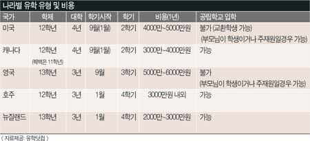 윤호정 유학닷컴 조기유학팀장은 “예년에 비해 단기 유학비중이 높아지고 있다”면서 “연령도 낮아져 초등학교 1~2학년에 해외에 나갔다가 중고등학교때 돌아오는 사례가 늘었다”고 밝혔다. 특목중이나 특목고에 입학해도 해외 유명 대학에 입학할 수 있는 길이 넓어졌다는 이유에서다.