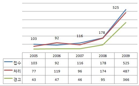 또 최근 5년간 가맹사업법 관련 사건 접수 및 처리현황은 2005년도 103건 접수 77건 처리, 43건 경고조치됐고, 이후 지속적으로 증가해 지난해 2009년에는 525건 접수 487건을 처리, 이중 366건이 경고조치를 받았다.