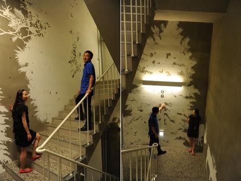 계단마다 표시된 숫자들을 보고 있노라면 러닝머신을 뛸 때 계기판에 표시된 숫자를 보는 듯한 착각을 일으킨다. 계단 한칸당 칼로리부터 누적 칼로리 소모까지 표시돼 있다. 또 벽에는 스트레칭하는 모습을 형상화한 그림이 익살스럽게 표현돼 있어 운동욕구를 자극한다.