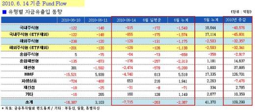 한편 채권형펀드에서는 2474억원이 순유출됐고, 머니마켓펀드(MMF)도 4740억원이 빠져 나갔다.