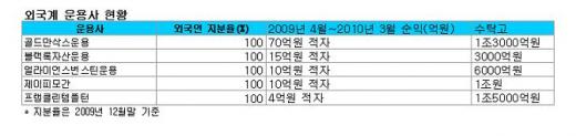국내 운용사들이 운용보수와 자산관리 수수료로 순익이 늘어난 반면 외국계 운용사들은 실적 악화로 골머리를 앓고 있다. 주력인 해외펀드가 마이너스 수익률이 난데다 비과세 혜택이 폐지되면서 투자자들의 외면을 받고 있어서다.
