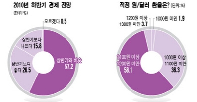 한국 기업 최고경영자(CEO)들은 올해 하반기 경제전망을 `장밋빛'으로 내다봤다. 유럽발 금융위기가 진정되고 금리와 환율이 정상 범위내에서 움직여준다면 경제 회복은 더 속도를 낼 것이라는 관측이다. CEO 대부분이 기업경영에 가장 큰 걸림돌로 `불안한 세계경제'를 꼽은 것도 같은 맥락이다. CEO들은 집값 전망에 대해서는 완만한 인하나 정체 쪽에 무게를 뒀다.