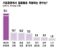 문제는 불안한 세계경제다. `기업 경영의 최대 걸림돌로 작용할 변수'를 묻는 질문에 `불안한 세계경제'를 꼽은 CEO는 72.1%(155명, 복수응답 허용)에 달했다. 유럽발 금융위기가 앞으로 어떻게 전개될지 촉각을 기울이는 모습이다.