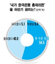 CEO들은 하반기 금리에 대해서는 현 상태를 유지해야 한다는 목소리가 높았다. `내가 한국은행 총재라면 하반기 금리를 어떻게 조정하겠느냐'는 질문에 응답자 중 54.5%(117명)는 `현 수준 유지'라고 답했다. 반면 `올리겠다'는 답변도 40.0%(86명)로 만만치 않았다. 그러나 `내리겠다'(5.1%, 11명)는 응답은 눈에 띄게 적었다. 금리 전망은 업종별로 시각차가 두드러졌다. 금융과 증권업계 CEO들은 각각 72.3%, 50.0% 비율로 금리를 올려야 한다고 답한 반면, 제조, 정보통신(IT), 건설, 바이오 업계 CEO들은 '동결' 의견이 60~62%로 높았다.