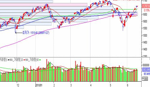 박성훈 우리투자증권 애널리스트는 "코스피 1700~1720선은 지난해 8월 이후 10개월 이상 이어진 박스권의 상단이자 유럽발 재정위기가 본격화되며 급락이 발생한 구간으로 상당한 저항이 예상돼 단기적으로 지수의 상승 탄력이 제한될 수 있다"고 분석했다. 그는 "주식시장이 6월 중반을 넘어서며 2분기 실적의 윤곽이 드러날 수 있는 시점인데다, 최근 반등으로 낙폭과대에 따른 가격메리트가 상당부분 희석된 상황인 만큼 실적에 대한 민감도가 재차 강화될 가능성을 이용한 매매전략을 세울 필요가 있다"고 강조했다.