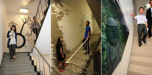 '계단'의 변화는 기업들이 먼저 이끌고 있다. KT NHN 대웅제약 등이 대표적이다. 층마다 다른 이미지로 꾸며서 계단을 오르내릴 때 지루함이 느껴지지 않도록 하는가 하면 한계단 한계단 오를 때마다 칼로리가 어느 정도 소모되는지를 기록하기도 한다.