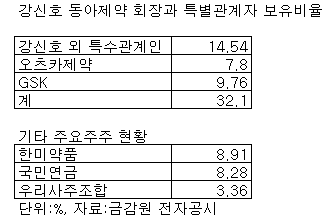 동아제약은 이밖에도 지난해 일본 오츠카제약과 포괄적 업무제휴를 맺으면서, 오츠카제약과 강 회장은 특수관계인으로 묶였다. 강신호 회장을 비롯한 현 경영진은 오츠카제약이 보유한 지분 7.8%의 의결권을 확보한 셈이다.