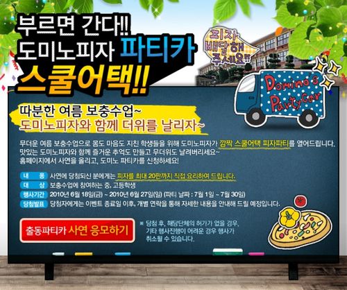 도미노피자는 오는 7월 한달 동안 여름보충수업을 진행하는 학교에 도미노피자 파티카(Party Car, 피자를 만들 수 있도록 제작된 차량)가 직접 찾아가 갓 구운 피자를 전달하고 무더위에 지친 학생들을 응원한다.