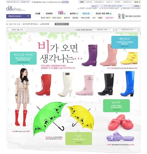 디앤샵(www.dnshop.com)에서는 '비가오면 생각나는 쇼핑아이템'기획전을 통해 우산, 레인부츠 등 장마철 필수품은 물론 장마철에 어울리는 패션 아이템도 함께 선보이고 있다.