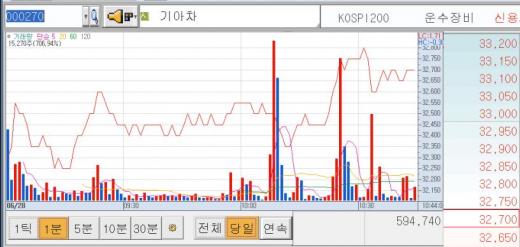 그림과 같이 기아차의 28일 분별 매매동향 차트를 살펴보면 처음 매수주문이 나온 지 약 18분 후인 10시 8분부터 9분까지 대규모 매수주문이 체결된 뒤 매도 주문이 체결됐고, 10시24분에도 비슷한 패턴이 이어졌다.