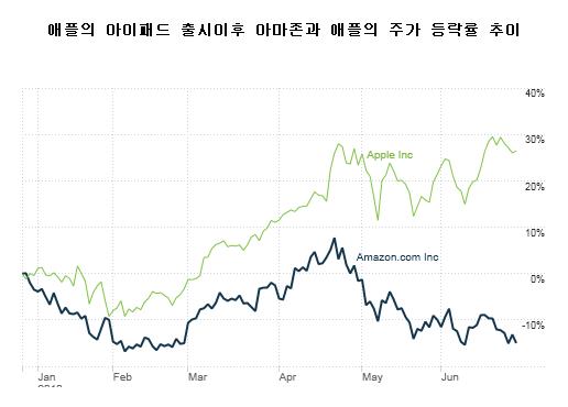 애플이 지난 1월 아이패드를 출시한 이후 아마존과 애플의 주가 등락률 격차가 갈수록 벌어지고 있다. 특히 아마존이 e북 리더기 '킨들'의 가격을 내린 이후 아마존의 주가는 더 떨어지고 있다.