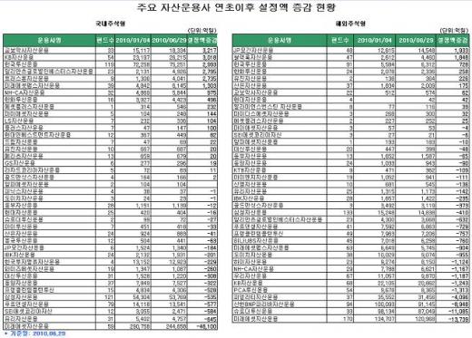 해외펀드에서도 미래에셋자산운용은 1조3739억원의 자금이 빠져 나가며 가장 많은 설정액 감소를 기록했다. 여기에 브릭스펀드로 국내 해외펀드 자금을 싹쓸이 했던 슈로던자산운용이 유럽 재정위기 등의 타격으로 환매가 속출하면서 설정액이 크게 줄었다. 실제로 '슈로더브릭스증권투자신탁' 시리즈는 1조원에 가까운 자금이 빠져나갔다.