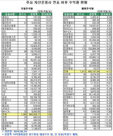 반면, 가장 많은 펀드를 운용 중인 미래에셋자산운용은 2.33% 수익률에 그쳤으며, 하나UBS자산운용은 1.89%로 평균 이하에 머물렀다. 또, 한국투신운용과 삼성자산운용은 각각 6.08%, 4.07%의 수익률로 간신히 평균에 턱걸이 했다.