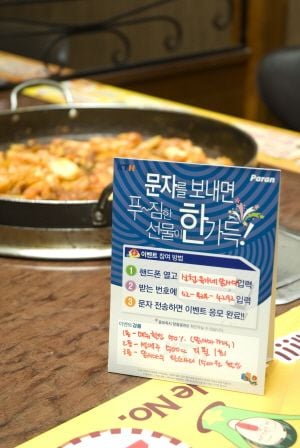 소규모 음식점은 경품 선정에 있어 한계가 있기 때문에 각 매장에서 부담 없이 진행할 수 있는 한도 내에서의 내용으로 고객 참여를 이끌어 내면 된다. 이 외에도 매장 밖에 입간판이나 Y배너를 설치, 매장 앞을 지나는 고객들의 자발적인 참여를 유도하는 방식으로 진행된다.