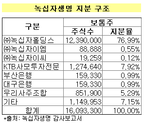 녹십자생명이 지난 6월 제출한 감사보고서에 따르면 현재 최대주주는 녹십자홀딩스로 1239만주(지분율 76.99%)를 보유하고 있다. 이밖에 KTB사모펀드가 7.92%, 우리사주조합 5.29%, 부산은행과 대구은행이 각각 0.99%의 지분을 들고 있다.