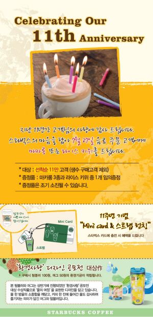 스타벅스커피 코리아, 11주년 기념 핸드폰 줄 증정하는 미니 스타벅스 카드 출시 등