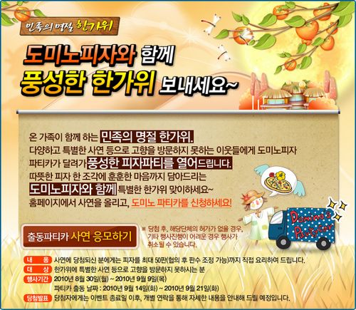 가을맞이 피자파티 그 첫 번째는 민족의 명절 한가위에 고향을 방문하지 못하는 이웃들을 위한 ‘도미노피자와 함께하는 풍성한 한가위’ 이벤트이다.