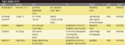 저렴한 가격으로 공연예술 작품들을 엮은 패키지 티켓도 현장에서 할인 구매할 수 있다. 서울시가 내놓은 '세종벨트 문화패키지 상품'은 높은 가격 때문에 주저하게 되는 공연과 전시를 싸고 알차게 즐길 수 있는 기회를 준다. 문화예술 프로그램 3종(무료 추천코스 포함)을 묶어 30~50% 할인된 가격에 선보인다.