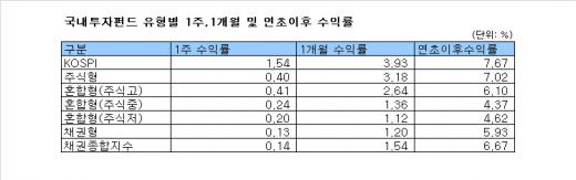 국내 주식형펀드는 3주 연속 오르며 3.67% 상승했다. 월별 상승률은 3.18%를 나타냈다. 코스피지수가 1800선을 돌파한 이후 안착에 성공하며 연고점을 높여가면서 주식형펀드 수익률도 양호한 흐름을 보이고 있다.