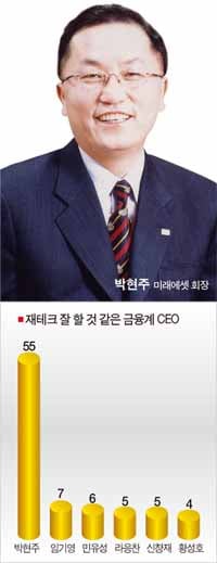 박현주 회장의 뒤를 이어 재테크를 잘 할 것 같은 CEO로는 임기영 대우증권 사장(7표), 민유성 산은지주 회장(6표), 라응찬 신한지주 회장, 신창재 교보생명 회장(각 5표), 황성호 우리투자증권사장(4표) 등이 꼽혔다.