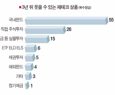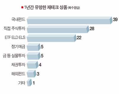 ‘향후 1년간 가장 유망한 재테크 상품’을 묻는 질문(일부 복수응답)에 대해서도 국내펀드(39명, 35.6%)와 직접 주식투자(28명, 25.5%)가 1, 2위에 올랐다.