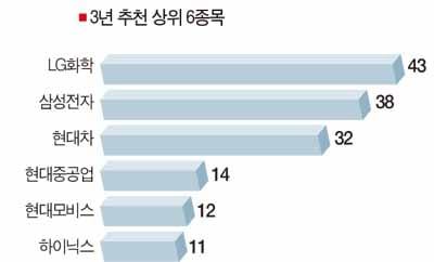 ‘지금 사두면 3년 후 웃을 수 있는 종목’을 3종목씩 뽑아달라는 질문에 43명이 LG화학을 선택했다. 올 한해 우리나라 주식시장을 이끌었던 IT와 자동차주의 대표주자인 삼성전자와 현대자동차는 각각 38명과 32명이 추천해 그 뒤를 이었다.