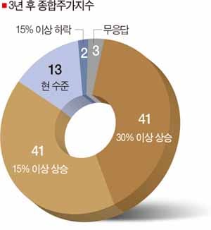 ‘3년 후(이하 2013년 말) 종합주가지수'를 묻는 질문에 ‘현 지수보다 30% 이상 상승한다’와 ‘현 지수보다 15% 이상 상승한다’는 응답이 각각 41명이었다. 10명 중 4명은 매년 10% 이상, 또 다른 4명은 매년 5% 이상씩 주가가 오를 것으로 본 셈이다. 어떤 경우든 코스피지수는 2000 시대를 맞게 되고 낙관적으로 보면 2500도 가능하다.