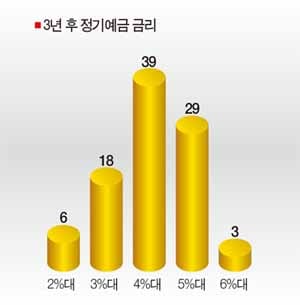 3%대를 예상한 박선희 외환은행 동수원지점 PB팀장은 “현재 3년 주기로 금리가 3~5%의 섹터에서 변동하는 것을 감안하고 현재 금리 수준이 3%대 후반임을 감안하면 3년 후는 오르막을 지나 내리막의 정점에 있을 것으로 보인다”고 말했다.
