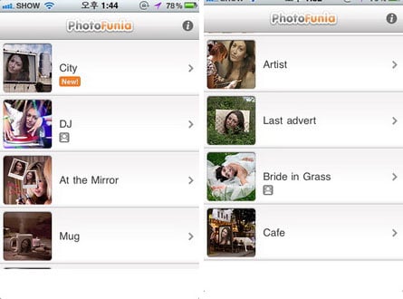 '포토퍼니아'는 사진을 합성해 멋진 분위기로 재탄생시켜주는 애플리케이션이다. 이 앱은 실행하면 샘플이미지 목록이 나타난다. 사용자는 목록에서 원하는 이미지를 선택하면 된다.