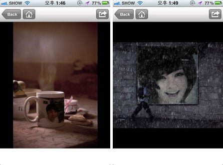 선택된 사진을 '포토퍼니아' 서버로 보내고 합성된 사진을 다시 받아오면 된다. 합성된 이미지는 사용자 선택에 따라 폰에 바로 저장하거나 e메일이나 문자, 블루투스로 전송해도 된다. '포토퍼니아'로 광고 속 모델로 변신해보자.