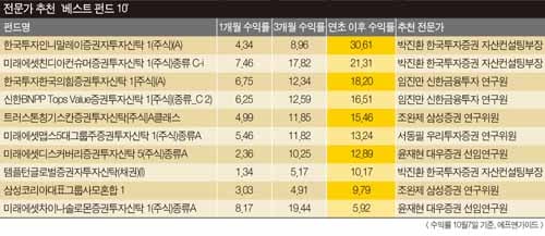증권사 전문가들이 추천한 펀드는 글로벌 시대에 걸맞게 다양한 지역을 망라하고 있지만 한국 증시에 투자하는 펀드를 추천한 경우가 가장 많았다. '유망 베스트 펀드 10' 중 국내 펀드는 6개가 포함됐다.
