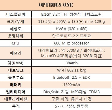 '옵티머스원'은 '국민스마트폰'을 지향하는만큼 스펙에서는 이렇다하게 내세울 것이 없다. 다만, 눈에 띄는 점은 구글의 모바일 운영체제(OS)인 '안드로이드'의 최신버전인 '2.2(프로요)'가 탑재돼 있다는 사실이다. 때문에 지원되는 프로그램들이 나름 최적화된 모습이다. 낮은 스펙이라고 해서 얕보면 안된다. 있을 것은 다 있다.