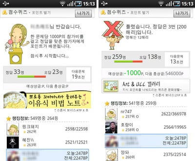 ‘퀴즈콘’에는 점수퀴즈와 실전대회가 있다. 점수퀴즈는 포인트를 얻고 랭킹을 올릴 수 있다. 문제의 답을 맞추면 오답자의 숫자에 따라서 주어지는 포인트가 달라진다. 반대로 문제의 답이 틀리면 오답자의 수에 상관없이 1000포인트를 잃게 된다. 점수퀴즈에 많이 참가해서 문제를 다보면 자신의 랭킹이 올라가는 것을 볼 수 있다.
